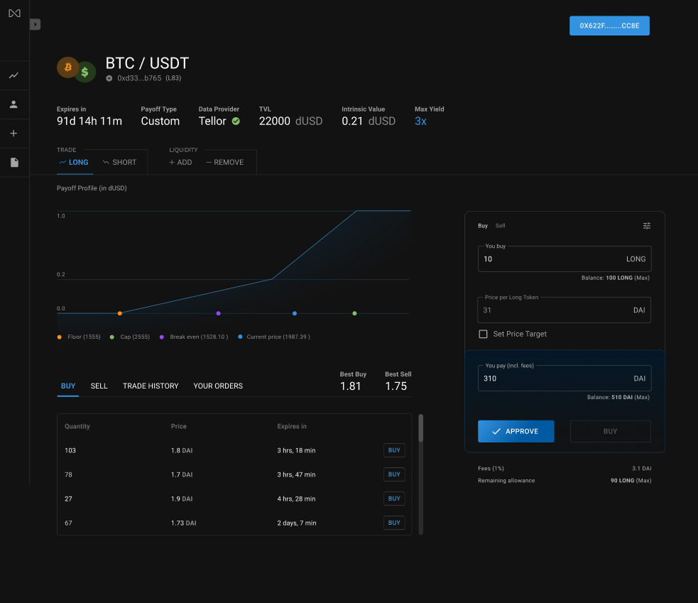 - Create Offer flow: We are adding an option for users to create derivative products in a more gas efficient and flexible way. Users will no longer have to create derivative products on-chain and take on the risk of not finding a counterparty. Instead, users will be able to create signed off-chain commitments to take either the long or short side of the derivative contract at very specific terms and share them with potential counterparties via various off-chain communication channels (e.g., email or chat). The derivative products are created only once a counterparty is found. Further, the Create Offer functionality will also remove the need for the creator to deposit the full collateral amount. Instead, a user can specify in the offer terms how much collateral each party has to contribute. With that, the sale of the long or short side, which in the current setup has to be conducted after a contingent pool has been created, would become part of the product creation process. The testing of the Create Offer flow will be part of the second testnet phase.